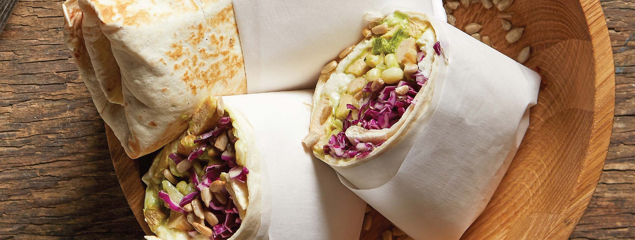 Para los burritosLicúa el chile poblano, caldo y crema hasta incorporar perfectamente. Calienta el aceite en un sartén y saltea la cebolla junto con los granos de elote hasta que la cebolla quede transparente. Integra el pollo al sartén y deja que tome un tono dorado por todos lados; aumenta el calor con sal y pimienta. Añade la salsa de poblano al pastel, baja el fuego, tapa y cocina durante 5 min. o hasta que el pollo esté bien cocinado al centro. Calienta las tortillas de harina en un comal y reparte el queso sobre cada una. Deja fundir y agrega una porción de pollo a la poblana. Termina con col, aguacate y semillas de girasol. Dobla la tortilla en forma de burrito y tuesta en el mismo comal. Comparte y disfruta los burritos con la salsa.