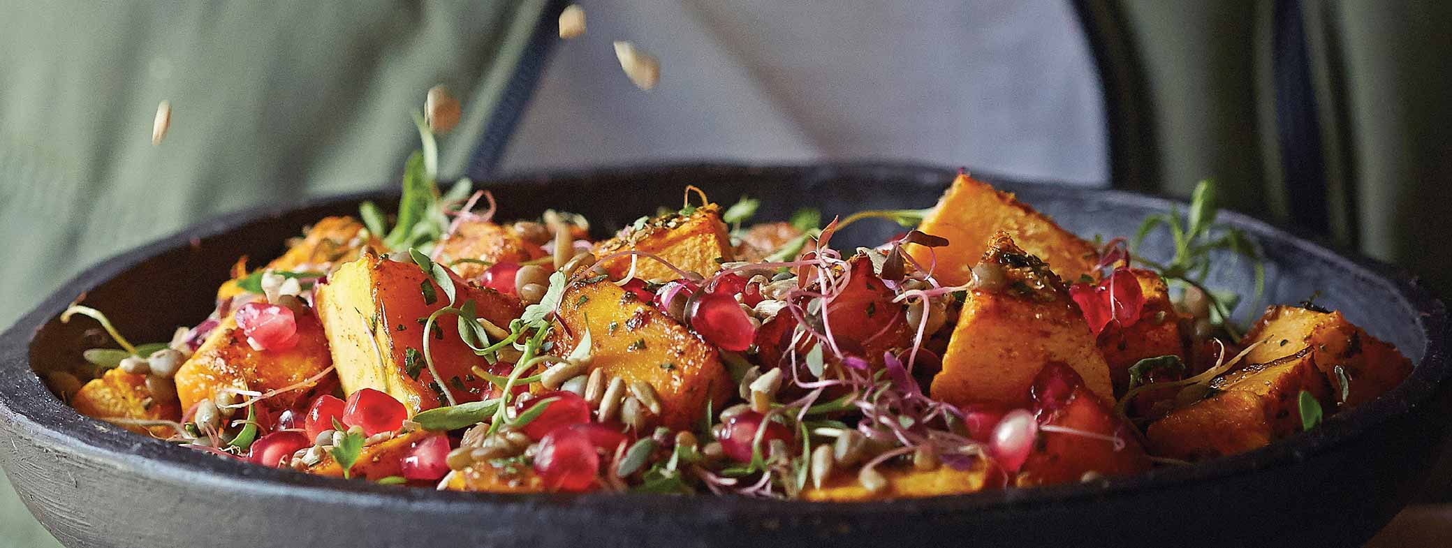 Para la ensaladaPrecalienta tu horno a 200°C. Coloca los cubos de calabaza en una charola con papel encerado. Rocía ligeramente con aceite en aerosol, baña con miel y espolvorea con especias y ajo. Hornea la calabaza hasta que rostice y suavice; por 25 minutos, aproximadamente. Retira del horno y deja enfriar por completo. Mezcla en un tazón las lentejas con los cubos de calabaza y el resto de los ingredientes. Incorpora la vinagreta y revuelve bien. Refrigera hasta el momento de servir y comparte.