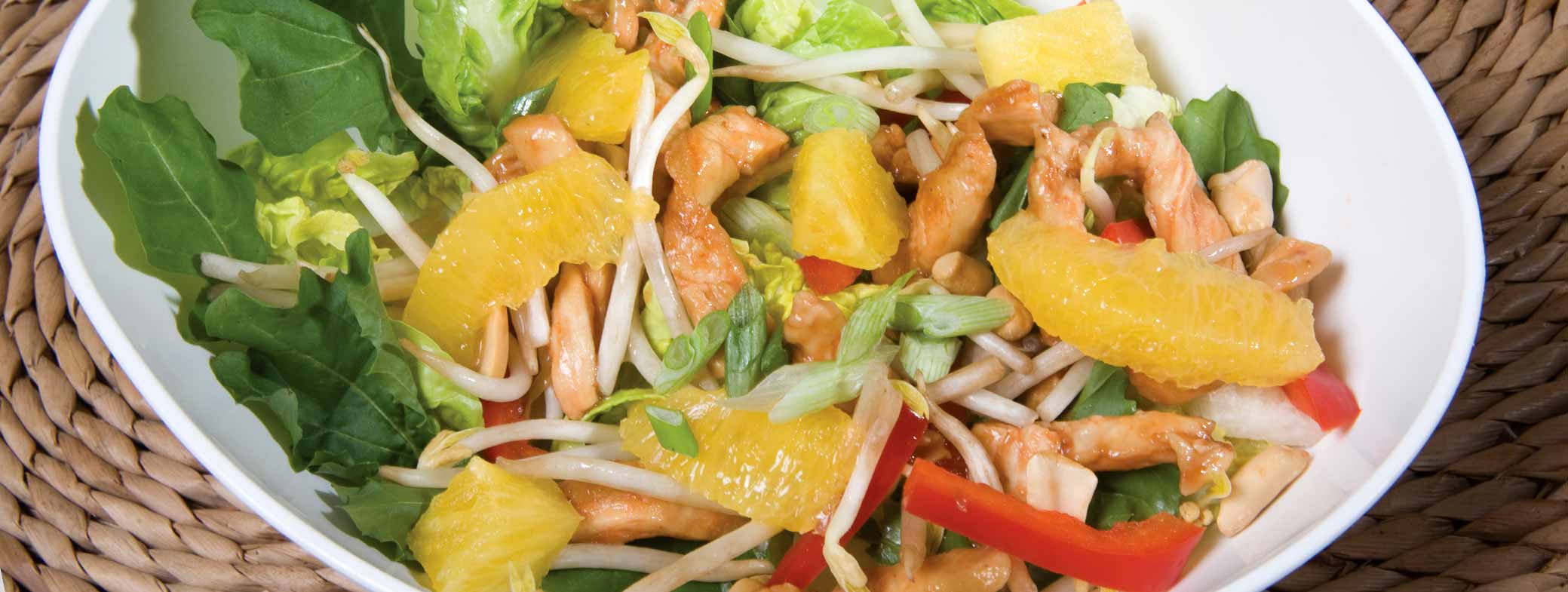Mezclar la ensalada: en un tazón o ensaladera, mezclar: lechugas, naranja, cacahuates, semillas de girasol, piña, germen de soya, pimiento morrón, pollo y cebolla cambray, aderezar con la vinagreta y poner el fideo encima. Decorar con hojas de cilantro frescas.