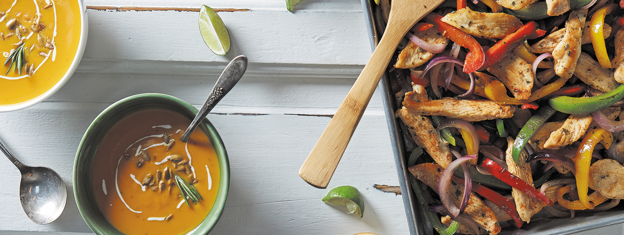 Reserva las fajitas calientes y pasa los cubos de camote a tu licuadora, añade el caldo y ralladura de limón y procesa hasta obtener una sopa cremosa y tersa.