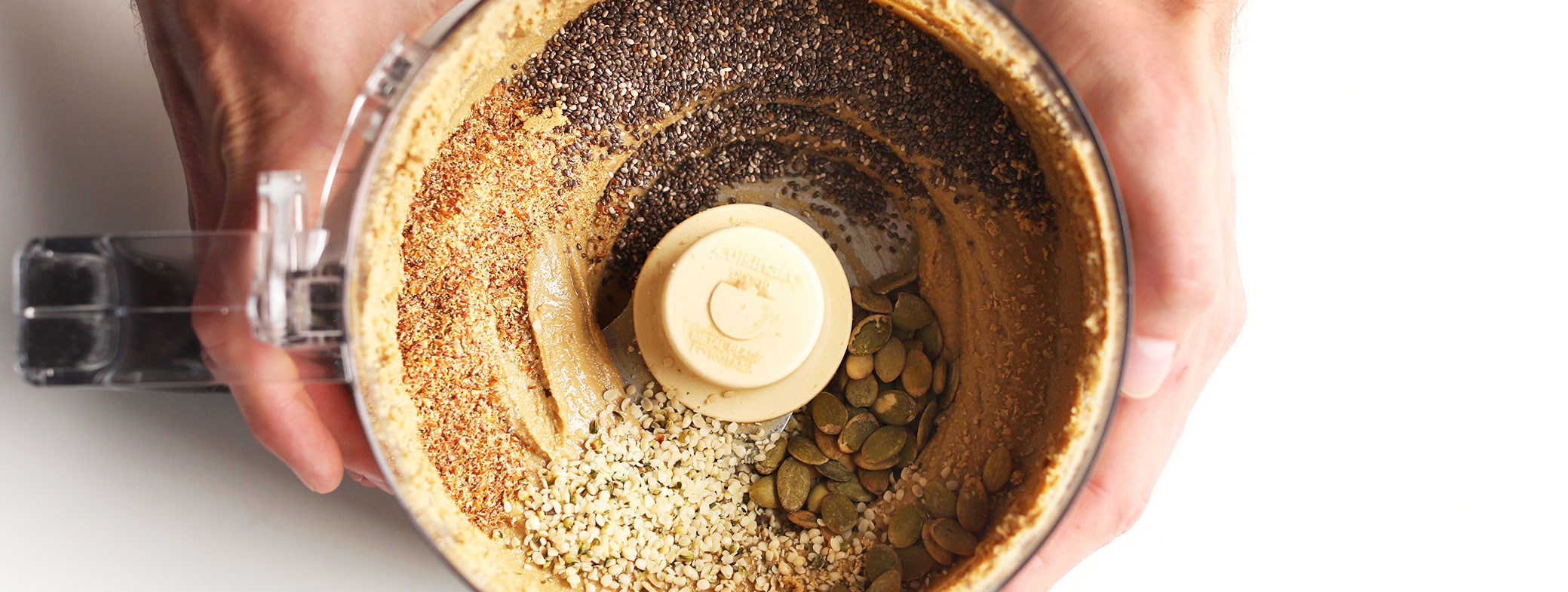 Añadir sal, semillas de chía, semilla de lino, semillas de cáñamo y semillas de calabaza y mezclar en el procesador para combinar. Probar y ajustar el sabor si es necesario, agregar más sal o un poco de edulcorante de elección si se desea (evitar el uso de edulcorantes líquidos, ya que pueden causar que la mantequilla pierda su viscosidad).