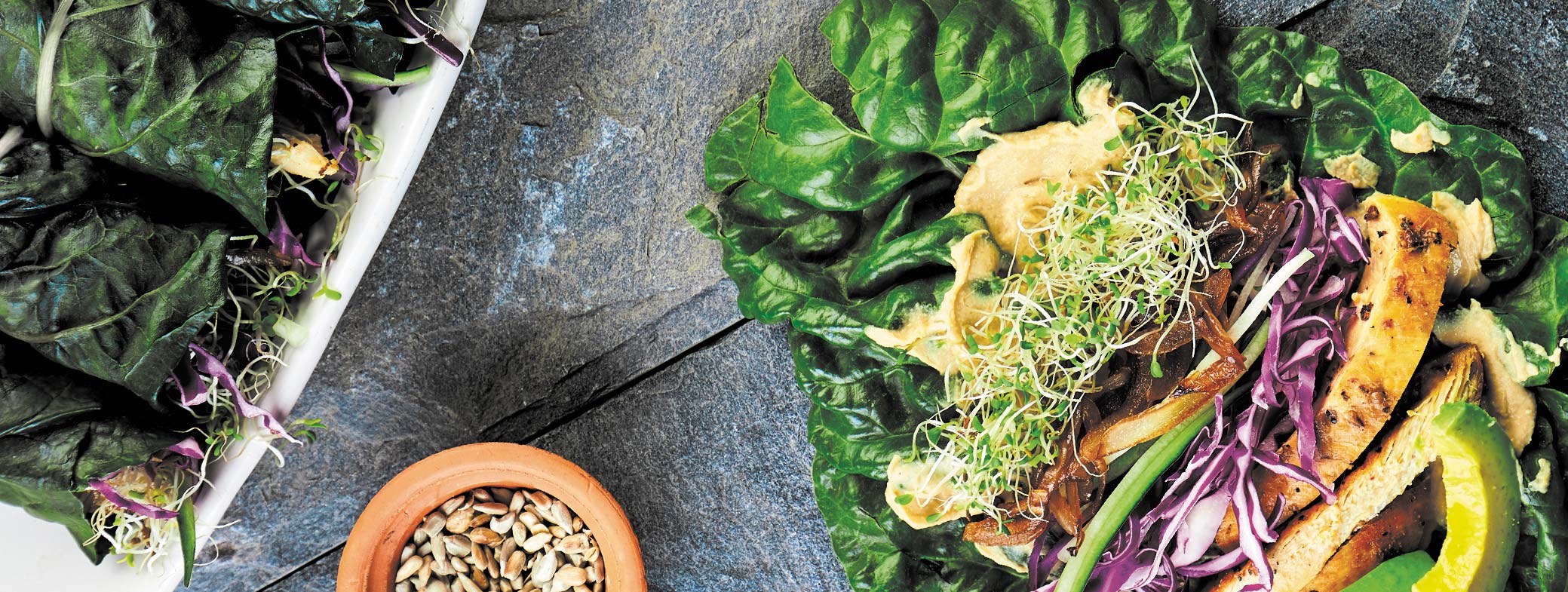 Extiende las hojas de acelga, coloca en el extremo más ancho una porción de tiras de pollo, cebollas caramelizadas, semillas de girasol y germinado.