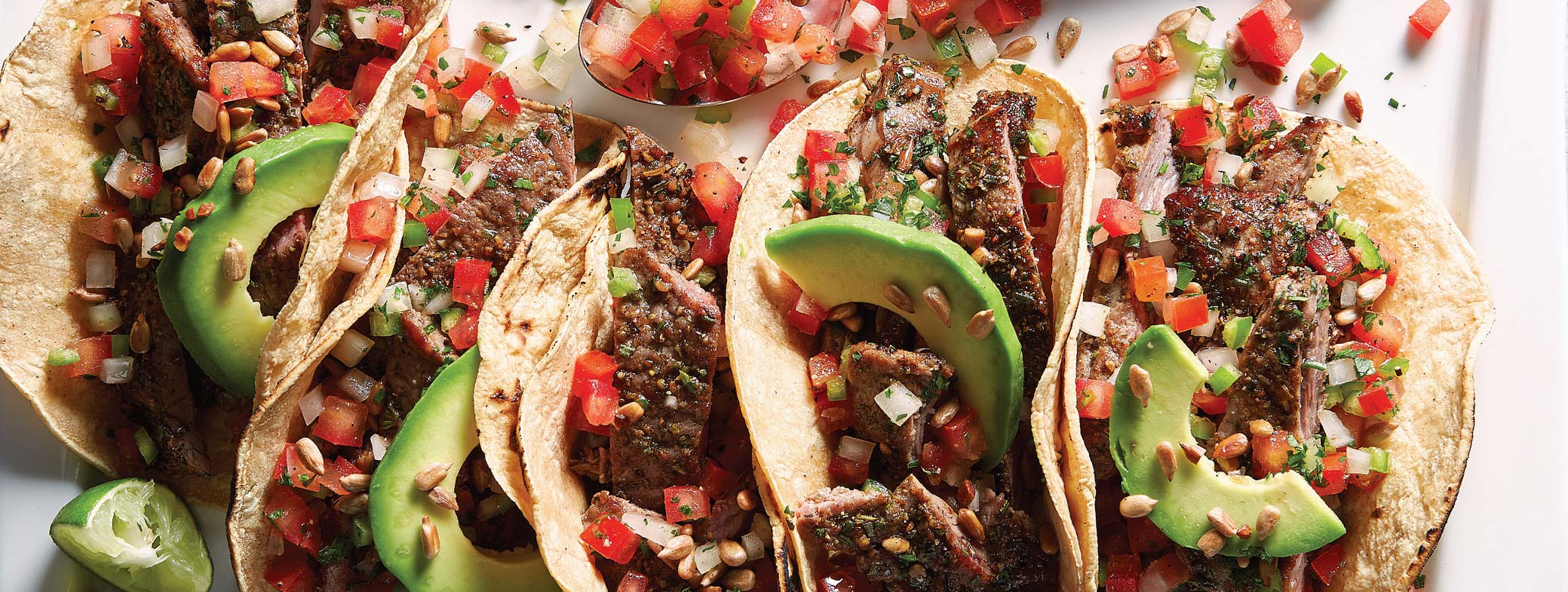 Para los tacosCombina en un tazón aceite de oliva, ajo, semillas de cilantro, romero y pimienta. Mezcla bien para obtener una pasta untable. Cubre la arrachera con esta preparación y cocínala en un sartén bien caliente por ambos lados hasta obtener el término deseado. Corta la carne en fajitas y arma los tacos con tortillas calientes, pico de gallo, semillas de girasol y aguacate. Comparte y Disfruta.